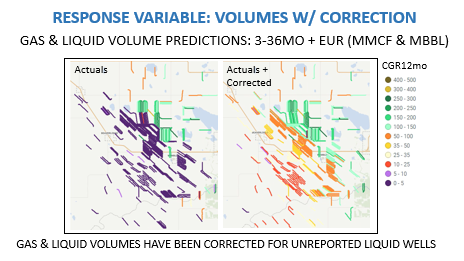 The corrected volumes dataset will include actual volumes on wells that have proper gas and liquids reporting.
